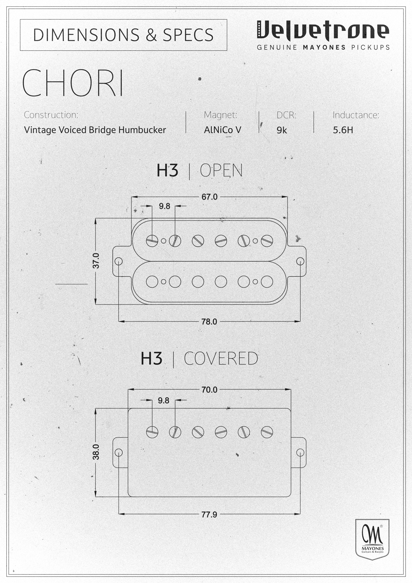 Velvetron Chori เป็น Pick up สไตล์ Humbucker ในตำแหน่ง Bridge ที่มาในสไตล์วินเทจ ค่า output 9k ให้โทนเสียงที่มีฮาร์โมนิกชัดเจน ใช้แม่เหล็ก Alnico V เหมาะกับผู้เล่นที่ไม่ต้องการความแรงของ output แต่ได้โทนเสียงแบบเต็มอิ่ม