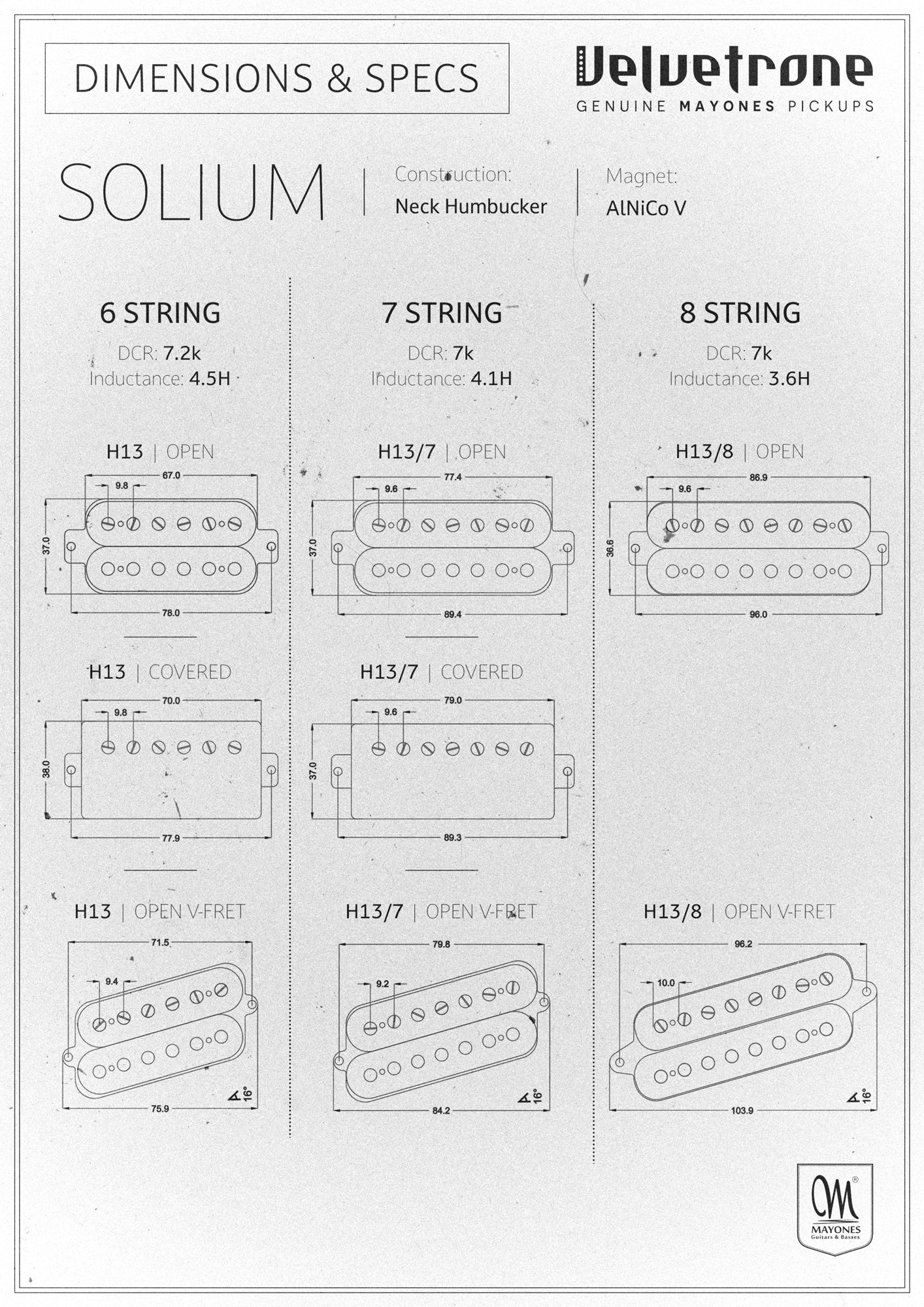 Velvetron Solium เป็น Pick up สไตล์ Humbucker ในตำแหน่ง Neck ที่ให้โทนเสียงฮาร์โมนิกที่สมบูรณ์ มีความบาลานซ์ของโทนได้อย่างดี และให้โทนที่อุ่นและนุ่มนวลของเนื้อเสียง ใช้แม่เหล็ก Alnico V มีให้เลือกใช้งานทั้ง 6 สาย , 7 สาย , และ 8 สาย โดย 6 และ 7 สาย มีค่าอยู่ที่ 7.2k และ 8 สาย ที่ 7k