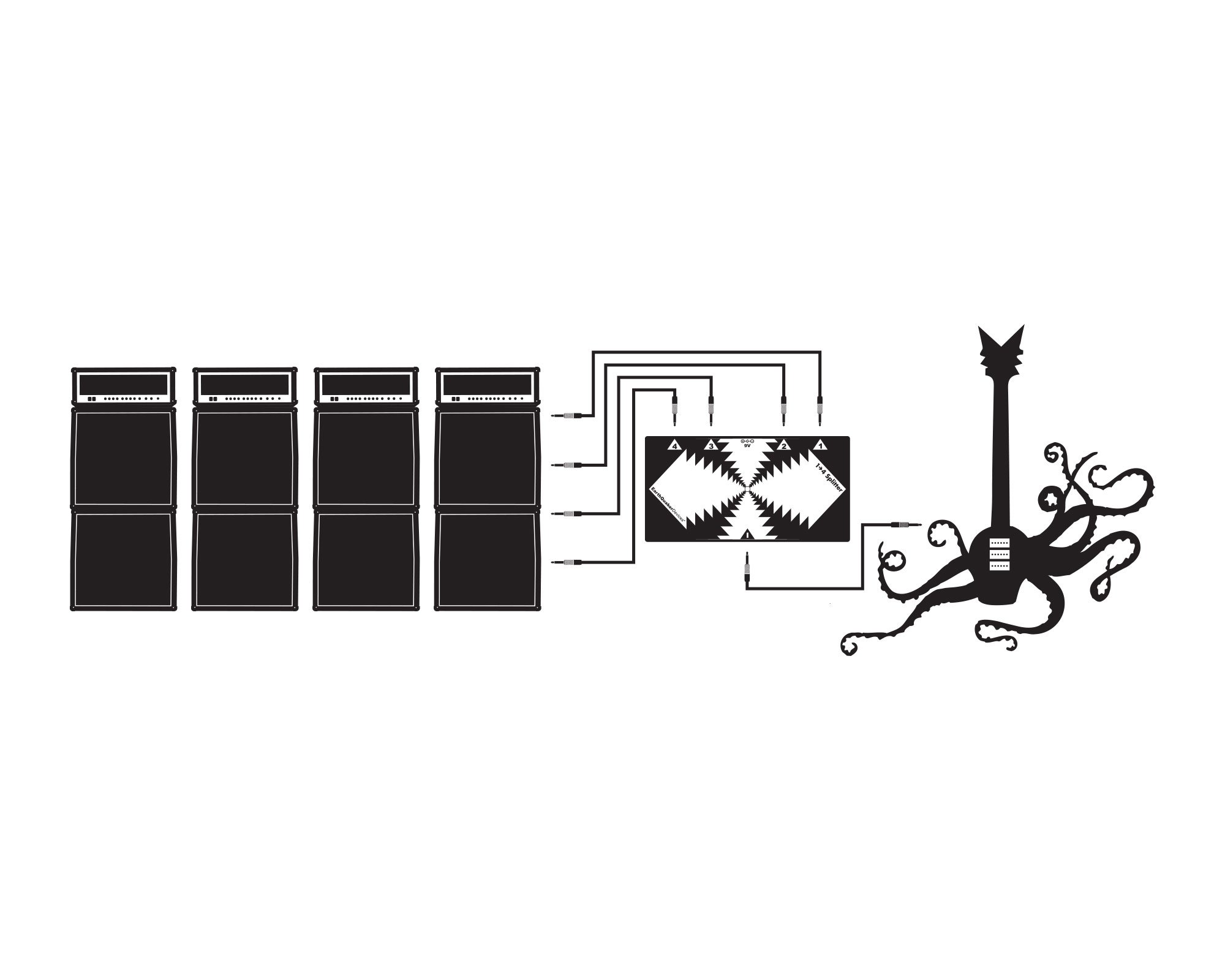 The One to Four Splitter allows you to take one input and send it through four buffered outputs for unlimited creative potential. This device features a unity gain buffer on each output for maximum punch and clarity. These buffered outputs have a flat frequency response with a high 1MOhm input impedance and a low 100 Ohm output impedance. This ensures that your signal won’t lose any quality and will sound just like you intended. Even long cable runs are no match for the One to Four Splitter.